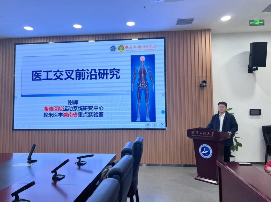 (通讯员 刘倩倩)2024年10月21日下午,应材料科学与工程学院、党委人才工作办公室邀请,中南大学湘雅医院运动系统研究中心主任、国家杰出青年基金获得者谢辉教授来我校进行学术交流。在综合楼103会议室,谢辉教授做了题为“医工交叉前沿研究”的学术报告,会议由材料科学与工程学院院长江学良主持,学校党委人才工作办公室主任季家友、国际学院副院长吴江渝、材料科学与工程学院副院长熊礼威及相关领域老师和研究生参加了本次报告。